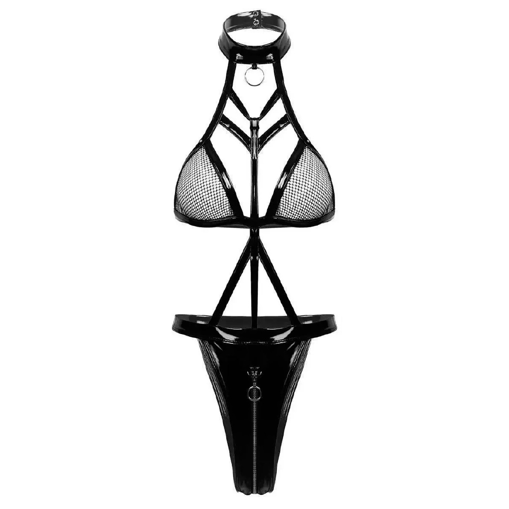 Este body arnés de vinil negro con detalles en red combina sensualidad y estilo vanguardista. Su diseño con tiras estratégicas realza la figura y brinda un look provocador, mientras que el cierre frontal añade un toque de practicidad y juego. Perfecto para noches intensas o para quienes buscan una pieza audaz y seductora.
